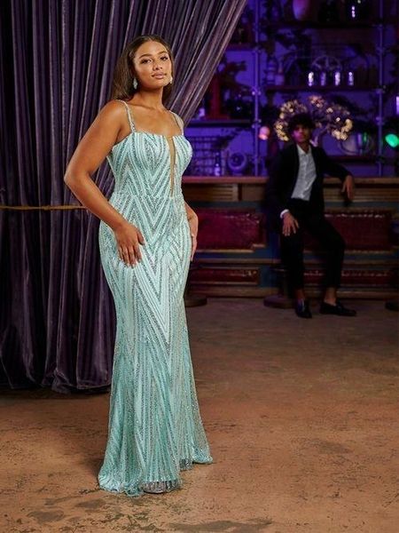 Sexy zig zag beaded mesh scoop neckline with deep v illusion neckline, sheer unlined back bodice with exterior satin casings GS